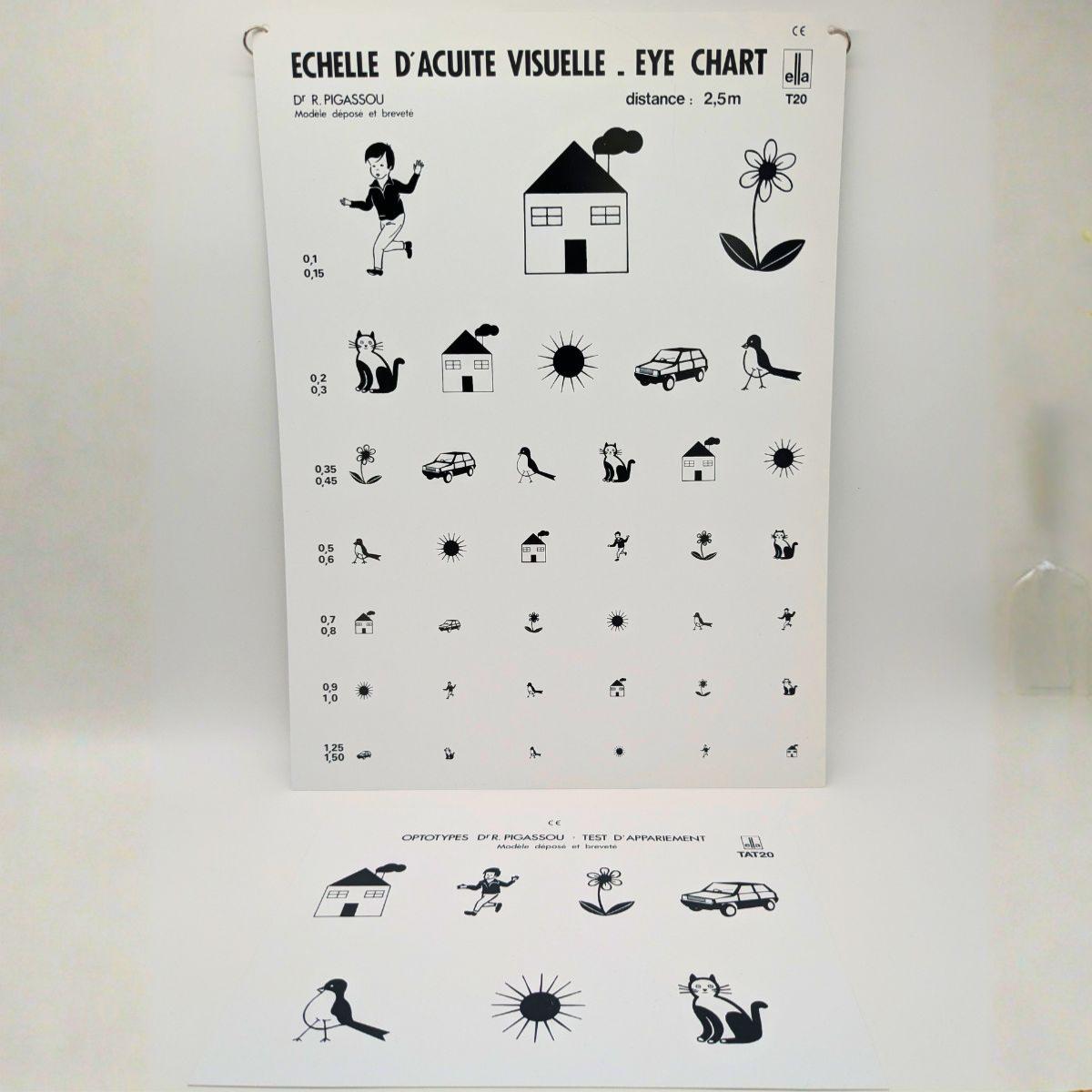 L’échelle Pigassou repose sur des optotypes illustrés (dessins) adaptés aux jeunes patients, permettant une mesure fiable de l’acuité visuelle de loin, même en l’absence de lecture alphabétique.